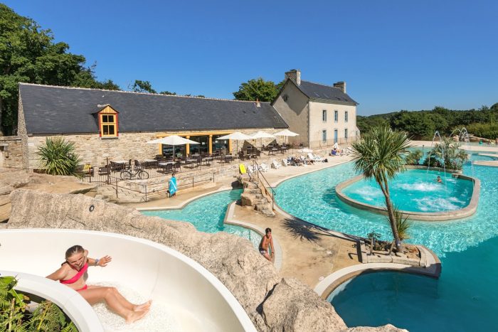 De camping ligt op een historisch landgoed aan de rivier de Odet, verscholen in een 45 hectare groot park met terrasvormige tuinen en boomgaarden. Zwemmen in de rivier mag niet vanwege de stroming, kanoën mag wel. En gelukkig is er ook een groot verwarmd aquapark met glijbanen, peuterbaden, watervallen en bubbelbaden! Zit het weer even tegen? Neem dan een duik in het kleinere, overdekte zwembad. Wie nog meer ontspanning zoekt, kan tegen betaling gebruikmaken van de wellnessfaciliteiten.